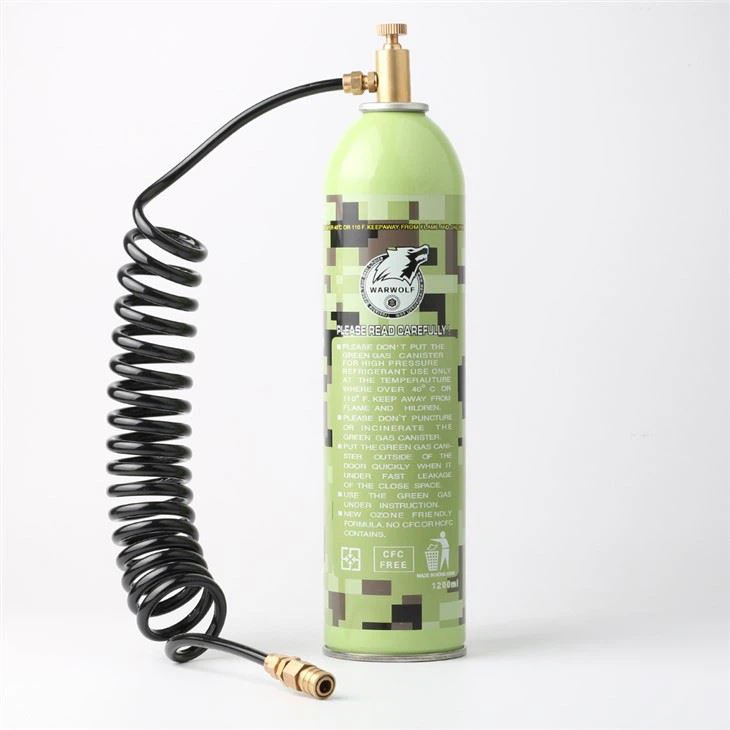 & quot;roheline gaas" airsoftis kasutatavad on tegelikult keemiliselt propaanile lähedasemad. Rohelise gaasiga töötavad airsoft-relvad töötavad silikoonõliga (airsofti rohelise gaasi põhikomponendid) segatud eeltäidetud suruõhu (nt propaani) klapiga juhitava vabastamisega. Mõnes kohas saavad kasutajad lihtsalt osta matkapoest suure propaanipurgi ja välise adapteri, et täita rohelise gaasi airsoft-püstoli; tavalist matkapropaani gaasi' ei segata aga eelnevalt silikoonõliga. Kui kasutajad otsustavad airsoft-rohelise gaasi asemel kasutada propaanigaasipaake, peavad nad aeg-ajalt siia-sinna määrdeainet lisama.